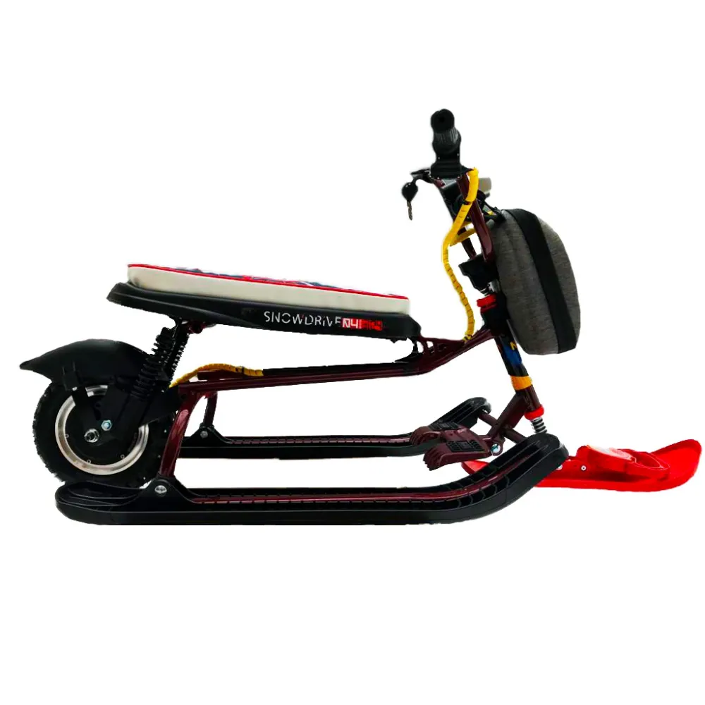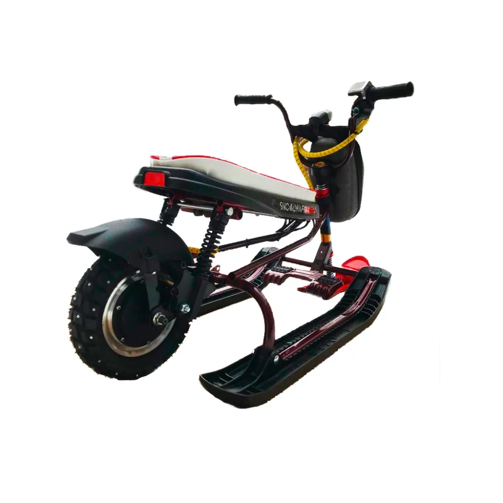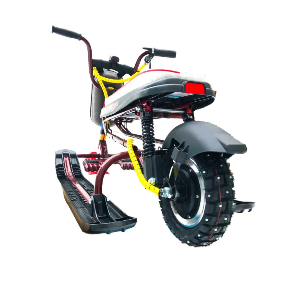 Наличие качественной амортизационной системы и шипованной резины исключают заносы на максимальных скоростях, делают движение плавным, повышают степень уверенности райдера. Время работы без дополнительной подзарядки составляет 2 часа. Электроснегокат оснащен удобным прочным сиденьем, не вызывает усталости и проблем с позвоночником.