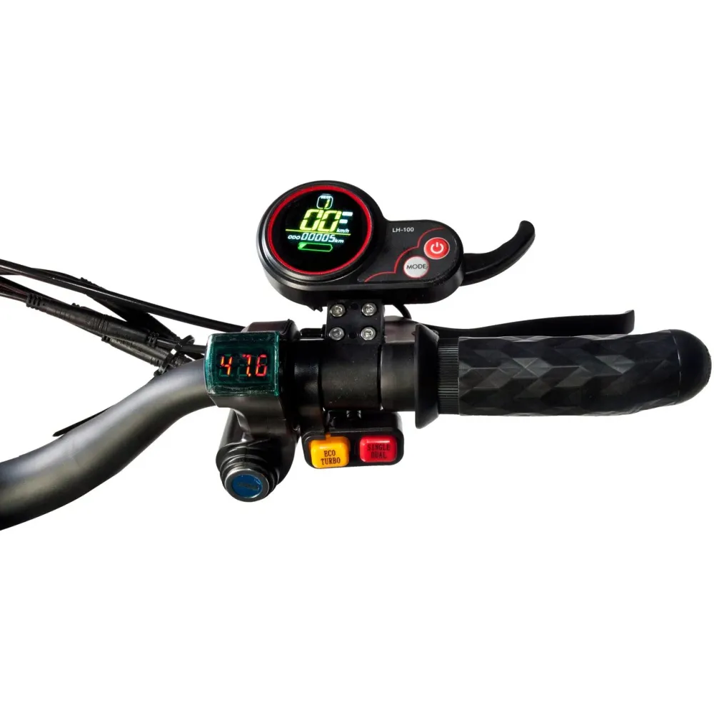 Электросамокат рассчитан на подростков и взрослое поколение. Внедрение современных инноваций и улучшенные характеристики вызывают интерес у продвинутых райдеров. Техника оснащена мощным двигателем 2400 Вт. Производитель позаботился об усовершенствовании показателей скоростных характеристик. Модель стремительно набирает максимальную скорость благодаря наличию полного привода. Электросамокат изготовлен из прочной стали и износостойкого полимера, при эксплуатации долго сохраняет свои первоначальные характеристики. Емкий аккумулятор быстро заряжается, продолжительно сохраняет заряд при движении.