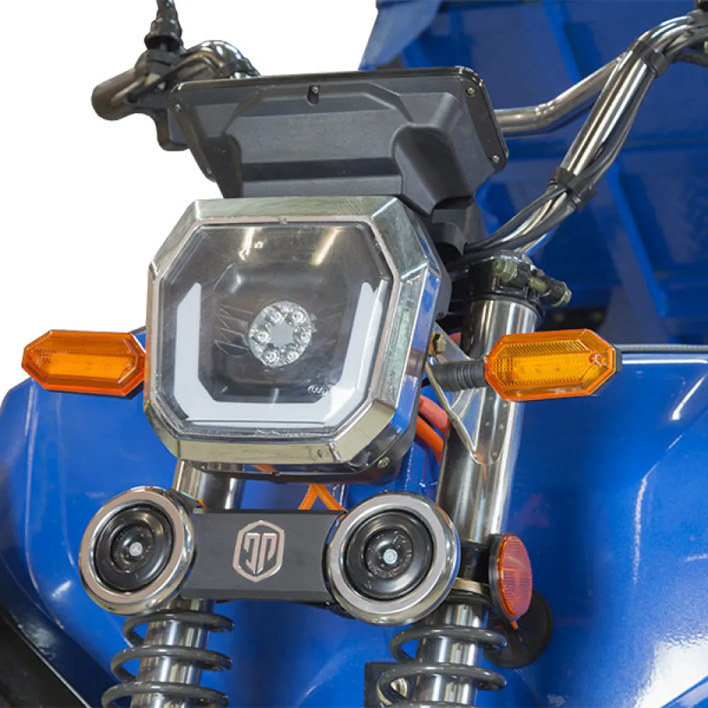 Этот электротрицикл оснащен гидравлическим приводом, что обеспечивает плавное и стабильное управление. Передняя подвеска состоит из усиленных гидравлических амортизаторов, которые обеспечивают комфортную езду даже на неровных поверхностях.