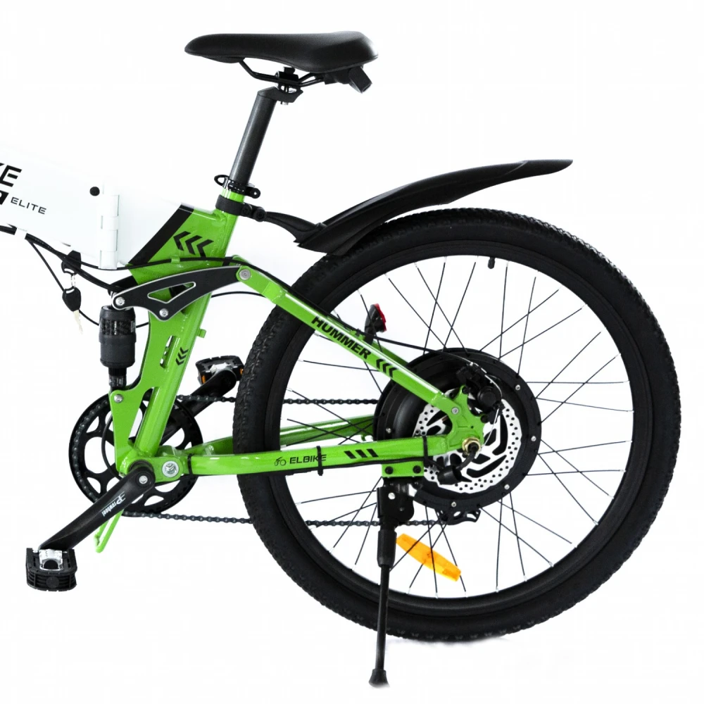 Электровелосипед Elbike HUMMER ELITE 13 Зелёный изготовлен в современном дизайне, с учетом пожеланий райдеров и наблюдений производителя. Максимальная грузоподъемность техники при массе 26 кг составляет 125 кг. Алюминиевая прочная рама выдерживает указанные нагрузки, не деформируется в течение всего срока службы. Если для вас езда по бездорожью и другой проблемной местности занимает лидирующие позиции, если прогулки на свежем воздухе важнее компьютера, предлагаем купить технику в нашем интернет-магазине.