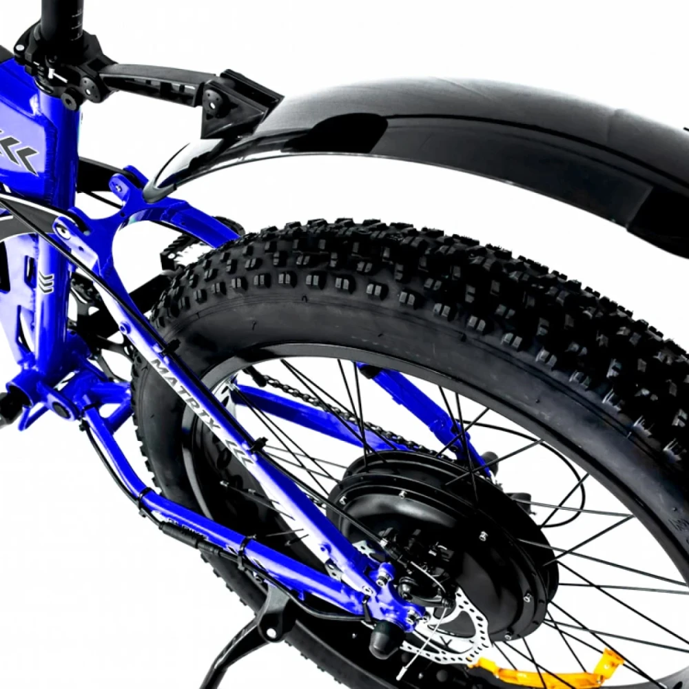 Оснащена электромотором мощностью 1500 Вт и емкой батареей на 13 А*ч, размещенной в раме. Технические характеристики позволяют развивать скорость до 45 км/ч и преодолевать на одной подзарядке 75 км пути. Особенностью модели является вездепроходимость и высокая степень комфорта. Модель оснащена внедорожными 26-дюймовыми колесами, рассчитанными на езду во всесезонье. Седло – мягкое, регулируемое, снимает нагрузку с позвоночника, минимизирует ощущение усталости, оснащено подседельными амортизаторами. Алюминиевая складная рама надежная и прочная, не деформируется при эксплуатации в жестких условиях. Рулевая часть не складывается, регулируется по высоте и углу наклона. Торможение проводится за счет оснащения техники передней и задней дисковой механической системой.